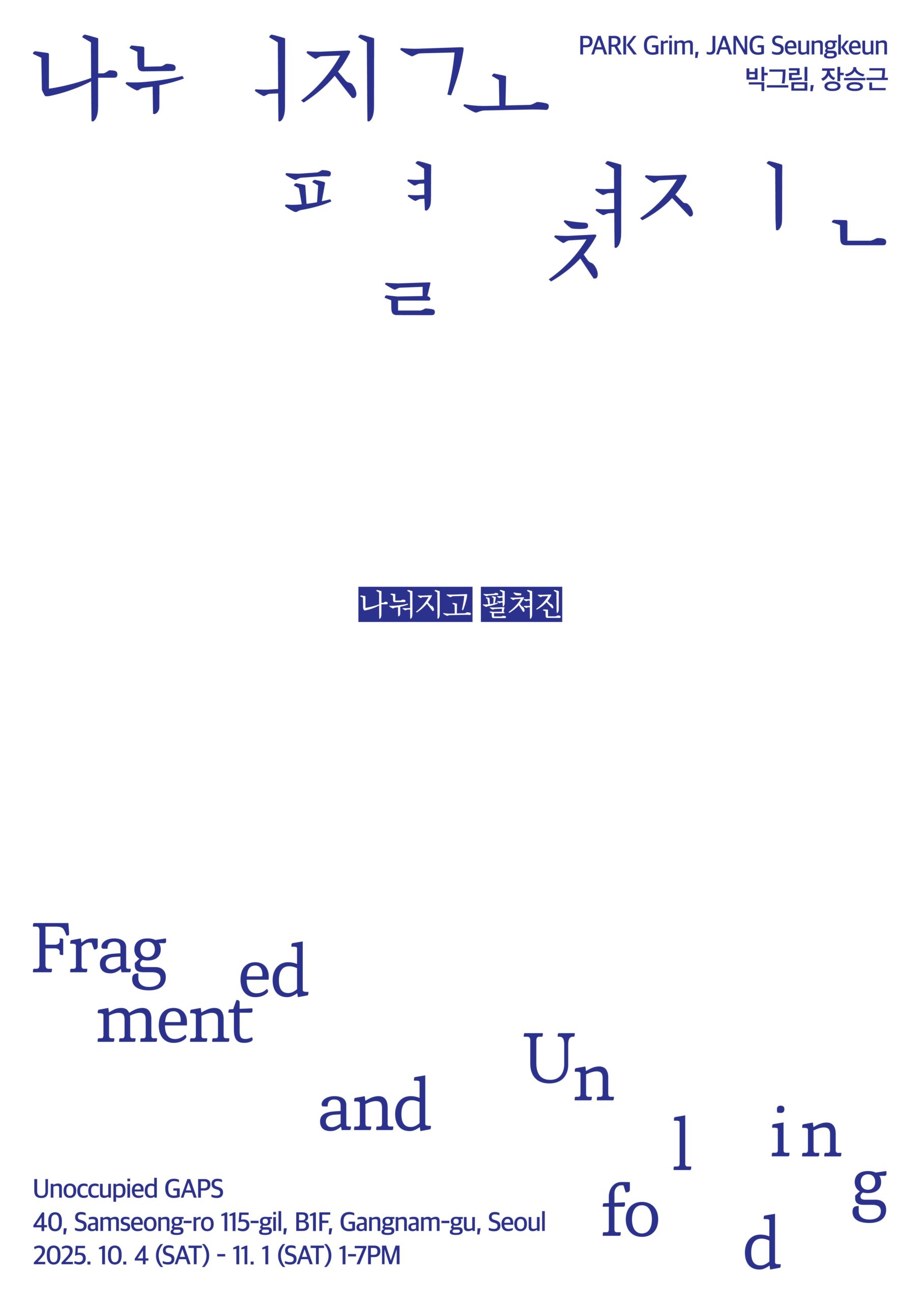 The exhibition “Fragmented & Unfolding” is a two-person show by artists Park Geurim and Jang Seunggeun, exploring a visual language centered on the themes of spatial division and expansion.