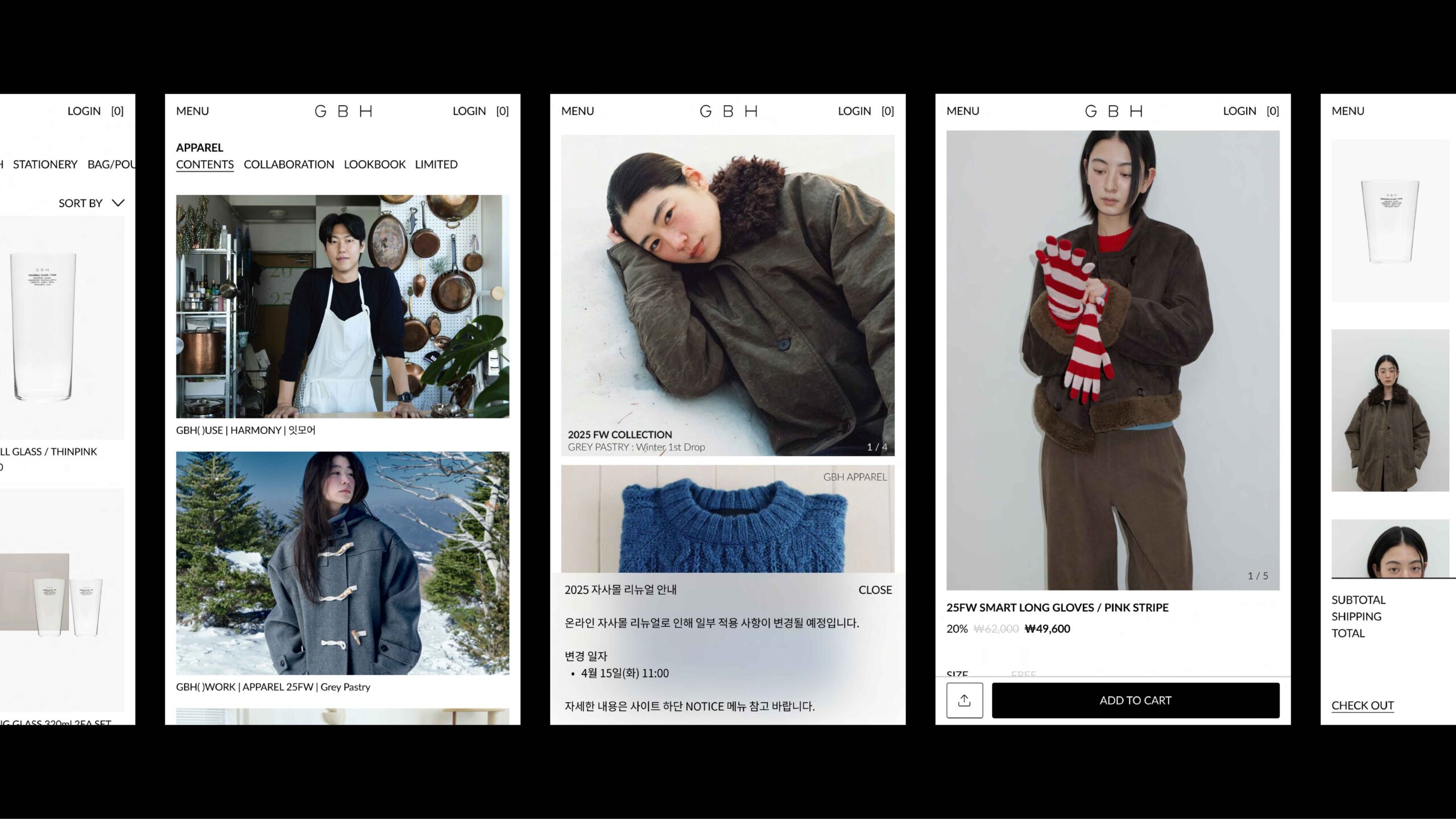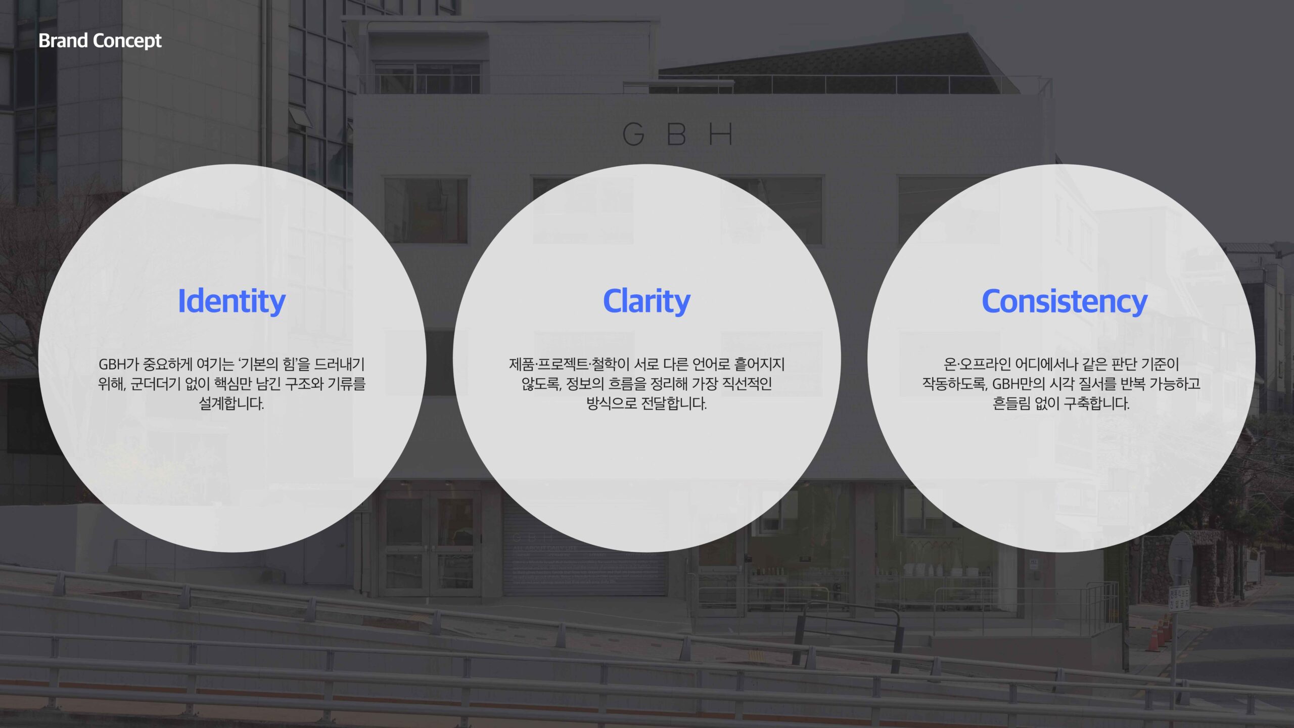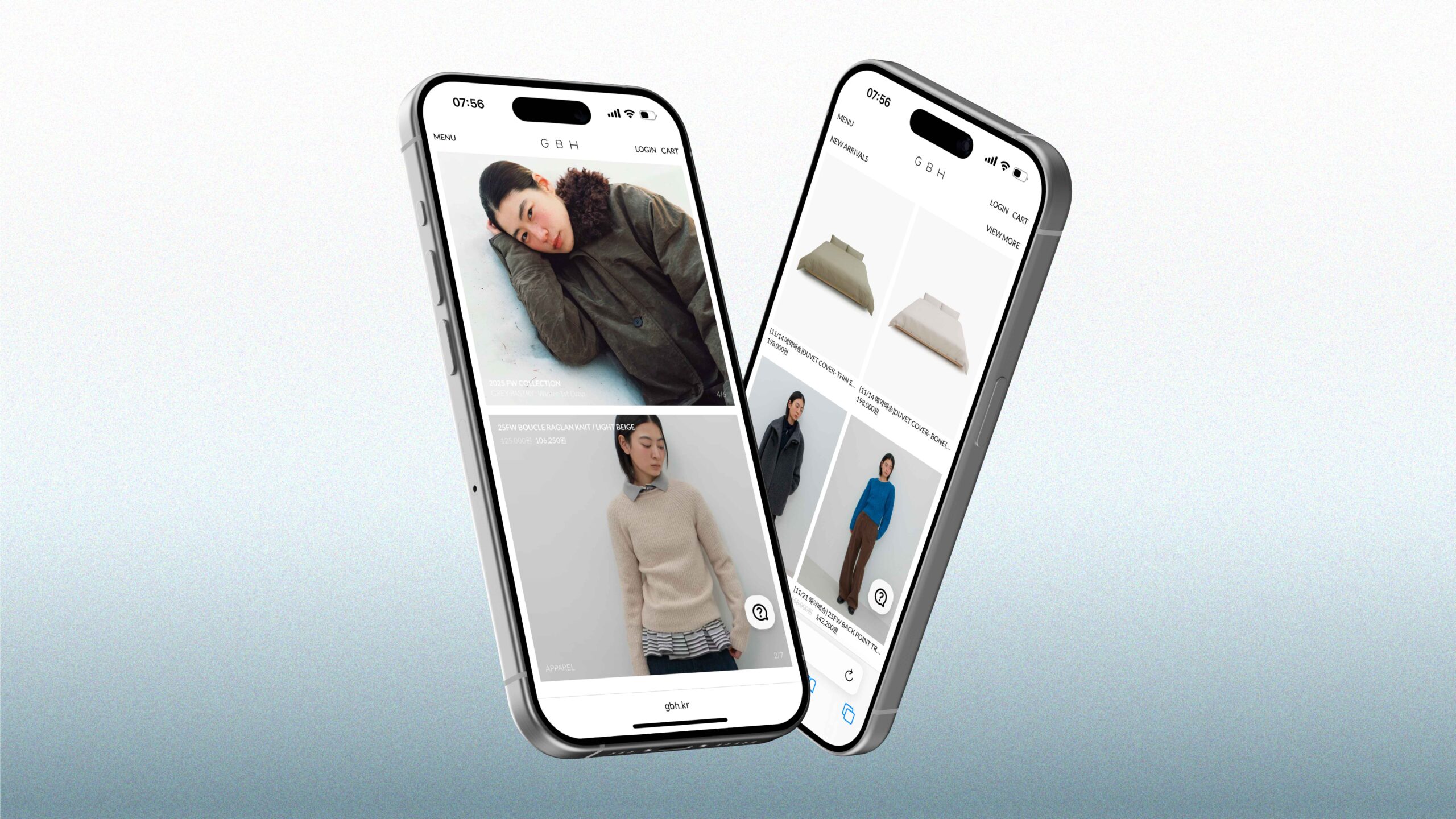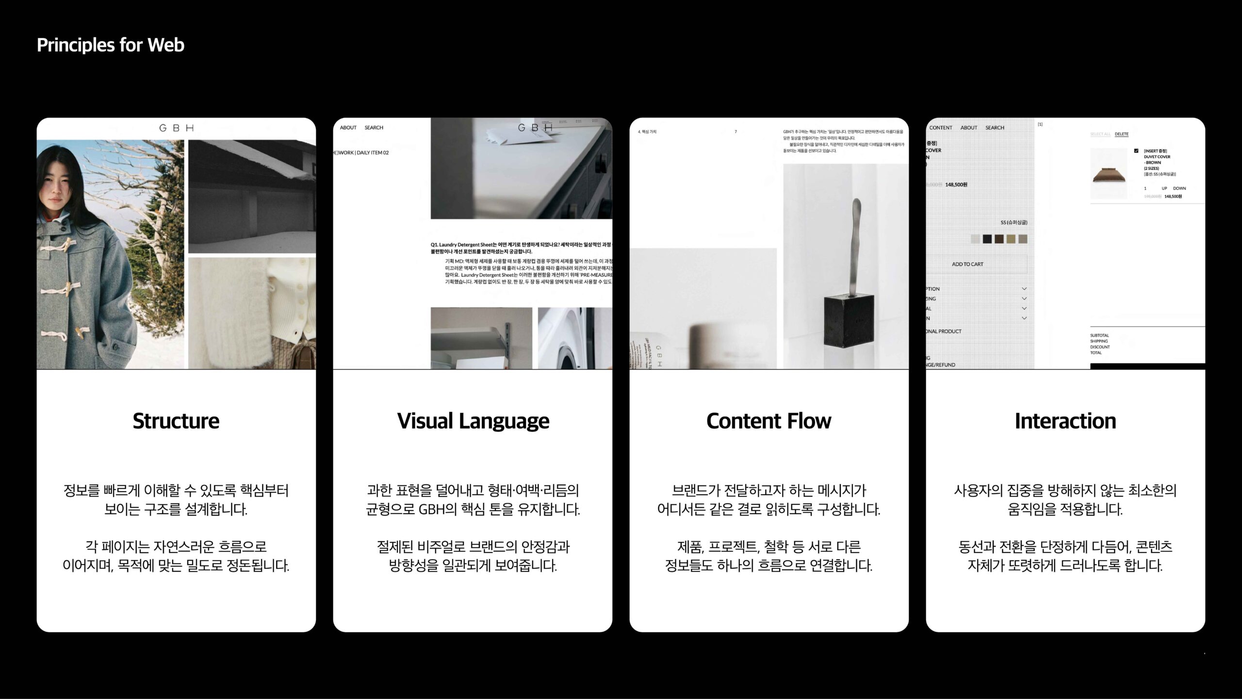 절제된 색상과 단정한 타이포그래피, 여백이 살아 있는 구성은 GBH가 추구하는 ‘정직하고 담백한 아름다움’을 시각적으로 풀어냅니다. 디지털 환경에서도 브랜드의 결이 흔들리지 않도록, 인터랙션과 전환의 리듬 역시 차분하고 일관된 톤으로 이어집니다.